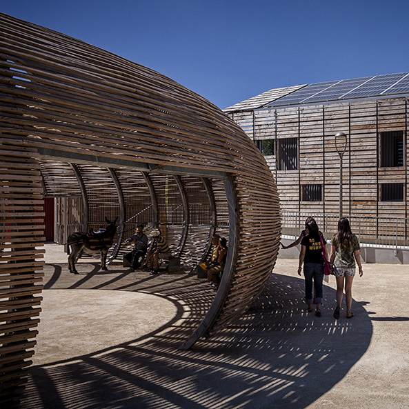 Mat. bio & géosourcés Bois + Terre crue, Toiture végétalisée épaisse semi-intensive , Ventilation nat. nocturne, Label E+C- : E3C1, Photovoltaïque, Réemploi d’éléments de charpente et de couverture
