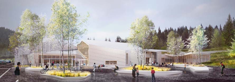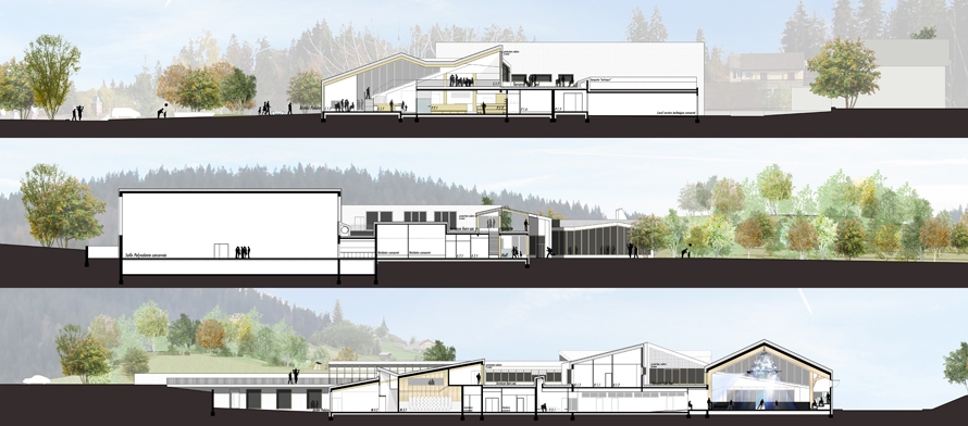 La mise en œuvre contemporaine de formes et de matériaux traditionnellement utilisés dans la région, offrira au bâtiment une image neuve et néanmoins ancrée dans son histoire. En ce sens, les volumes reprennent le principe des toitures à deux pentes avec un faîtage horizontal, caractéristique de l’architecture des montagnes. Ce faisant, les volumes allongés du bistrot polaire et de la galerie affirment leur fraternité avec les volumes anciens en second plan, ne les discréditent pas, participent du même horizon et les relient. C’est la forme du plan, inspirée des mondes polaires qui induit une autre géométrie plus spécifique. Si les techniques traditionnelles de charpente bois sont ici à l’œuvre, l’image apparue est celle d’un bâtiment à vocation culturelle. De même, le choix du bardage poursuit cette réflexion. La tuile de métal appartient à la culture jurassienne moderne, mais aussi, dans une version plus lumineuse, plus technologique à la peau des stations polaires et de grands équipements culturels internationaux. Les volumétries existantes, conservées, sont isolées par l’extérieur afin de leur assurer une performance énergétique optimale. La mise en œuvre d’une nouvelle enveloppe leur donne une image contemporaine adaptée au nouvel usage. Cette nouvelle peau est métallique perforée selon un motif inspiré du givre. Les couleurs blanc et métal laqué confèrent une unité. Le bois omniprésent, la couleur blanche des murs et du mobilier, le noir brillant des sols et la transparence du verre apporteront lumière et confort aux espaces intérieurs.