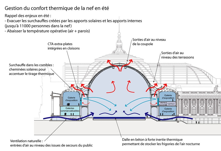 6_ La réversibilité : Le projet est réversible, construit en filière sèche (bois, acier, verre). Sa démontabilité rendra simple son évolution ultérieure (« pour les générations futures »). Le lourd (la pierre, la fonte, l’acier) et le pérenne, c’est l’existant, le Grand Palais déjà là. Le léger et le durable un temps (même long), c’est le projet : il projet est mobilier. De la sorte, les apports contemporains ne troublent pas la lecture des éléments patrimoniaux sculptés, courbes et massifs.